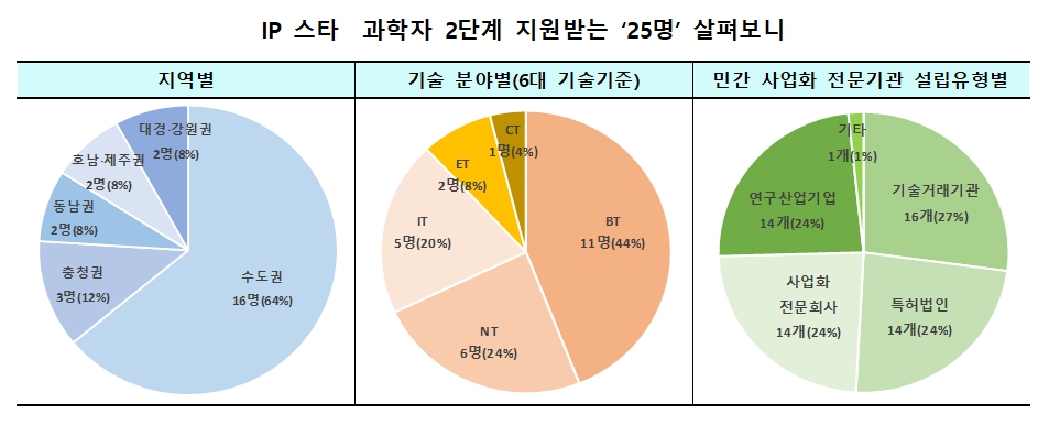 2단계 지원 대상자로 선정된 연구자 25명을 분석한 결과, 수도권 소속 연구자가 16명(64%)으로 가장 많았고, 기술 분야별로는 생명기술(BT)이 44%로 가장 높은 비중을 차지했다. 이 밖에 나노기술(NT) 24%, 정보기술(IT) 20%, 에너지기술(ET)과 문화기술(CT) 분야도 포함됐다. 협업 민간기관 유형은 기술거래기관, 특허법인, 사업화 전문회사 등으로 고르게 분포했다.