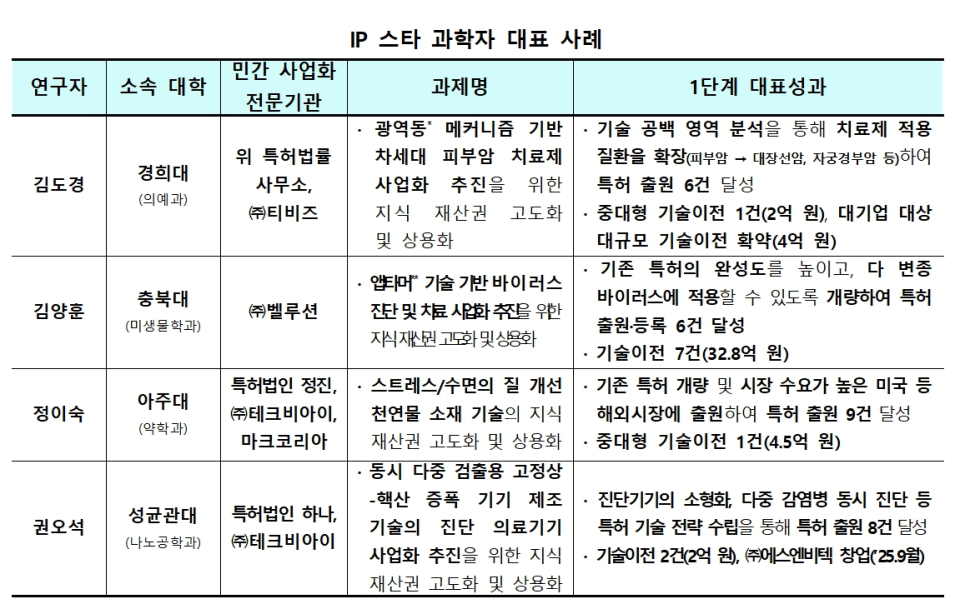 과기정통부는 IP 스타 과학자 지원형 사업을 통해 민간 사업화 전문기관 시장을 확대하는 한편, 연구자가 기술사업화의 실질적인 주체로 활동하는 구조를 정착시키겠다는 계획이다. 올해부터는 지원 대상을 대학 연구자뿐 아니라 출연(연) 연구자로 확대하고, 매년 신규 과제를 선발해 지원을 지속할 방침이다.