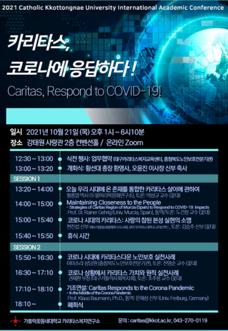 가톨릭꽃동네대학교(총장 황선대)는 10월 21일(목) 오후 1시 강태원사랑관 컨벤션홀에서 <2021 가톨릭꽃동네대학교 국제학술대회>를 가졌다. 본 학술대회는 가톨릭꽃동네대학교 카리타스복지연구소가 주관하고, 대학혁신지원사업이 후원하여, “카리타스, 코로나에 응답하다!”라는 주제로 가톨릭꽃동네대학교 컨벤션홀에서 열렸다. 온라인 zoom으로 병행한 본 학술대회에 총 90여명의 온라인 참석자가 함께 하였다.
